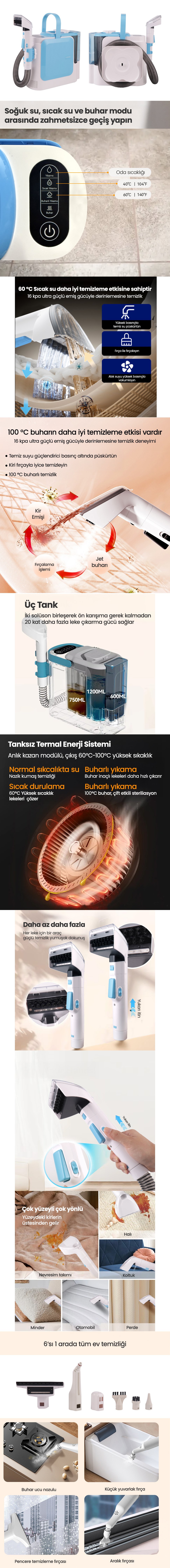 17Kpa güçlü emiş sistemi, inatçı kirleri bile anında söküp alırken, 65°C sıcak su spreyi lekeleri çözerek hijyen sağlar. 3 farklı tank sistemi sayesinde temiz su, atık su ve temizlik solüsyonu birbirine karışmadan çalışır.